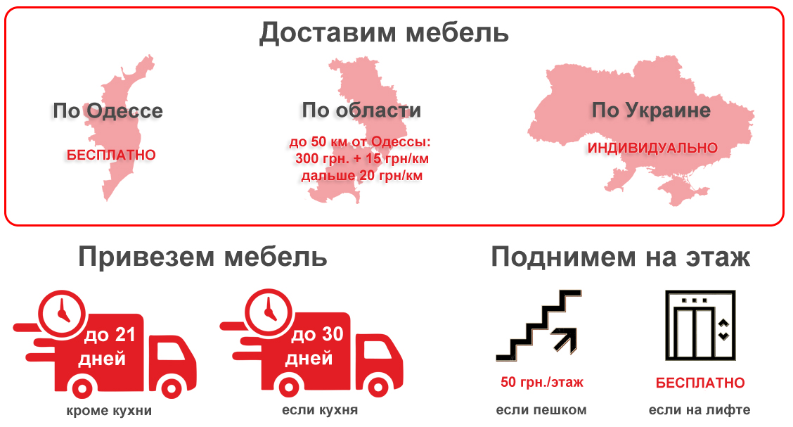 Доставка в течение 3-х недель (все кроме кухни) и до 30 дней при заказе кухни.