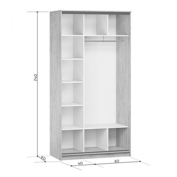 Заказчик может самостоятельно выбрать габариты шкафа, количество и размеры полок, высоту проемов, антресольную часть, наличие и количество ящиков.