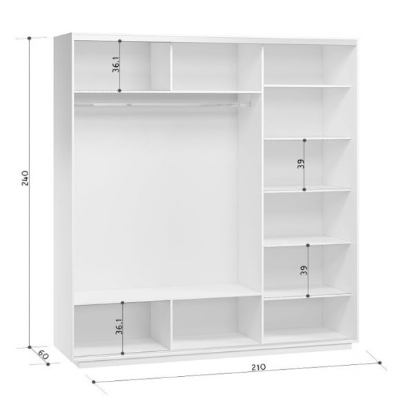 Шкаф-купе «Монако» – это вместительная конструкция для хранения одежды, обуви, предметов гардероба и других вещей. Три больших зеркальных во весь рост фасада станут великолепным дополнением в комнате или прихожей. По бокам двери находятся ленты-щетки, которые предотвращают попадание пыли внутрь шкафа и обеспечат бесшумное открывание и закрывание двери. За дверью вас ждет продуманное внутреннее наполнение: глубокие полки и отдельный отсек со штангой для вешалок. Какие еще преимущества имеет такая мебель? Рассмотрим основные из них: