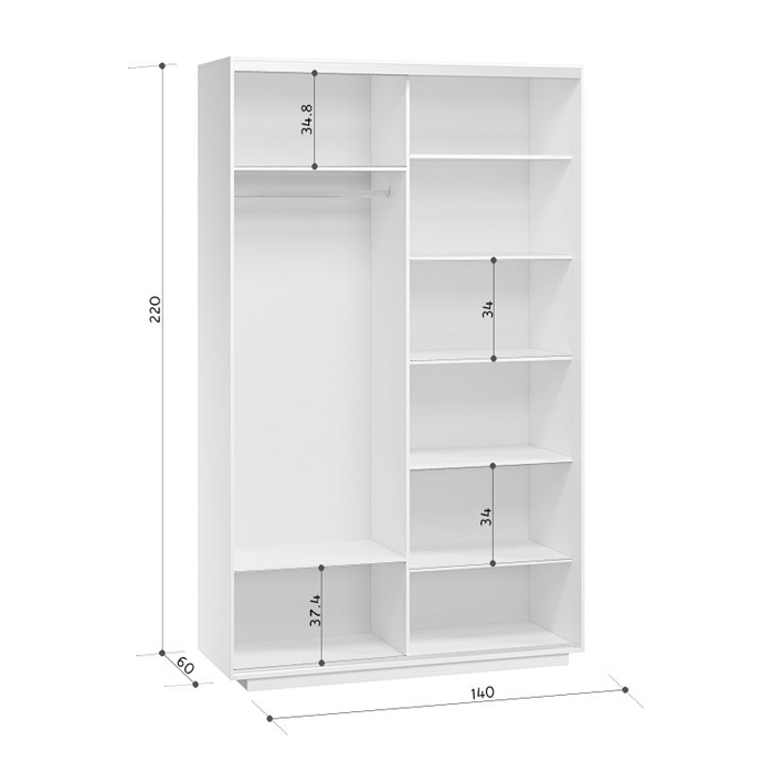 Заказчик может самостоятельно выбрать габариты шкафа, количество и размеры полок, высоту проемов, антресольную часть, наличие и количество ящиков.
