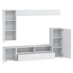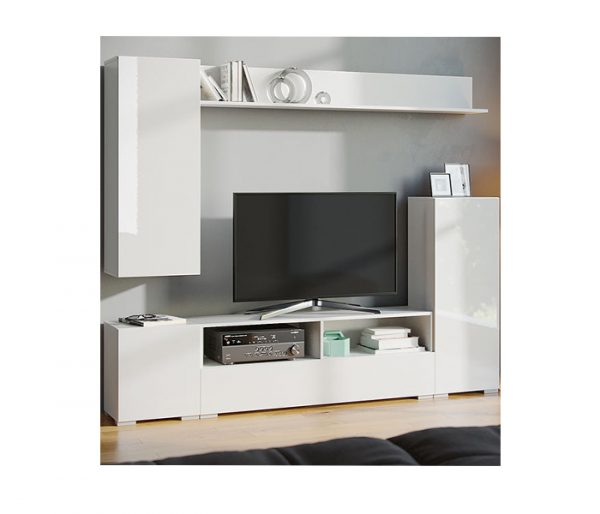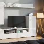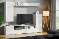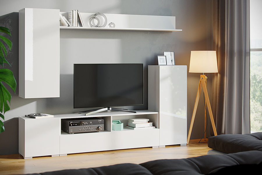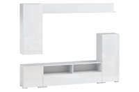 Вітальня “Берн” – це сучасне облаштування ТВ-зони. Модель не займе багато місця, навпаки, візуально розширить простір кімнати завдяки здатності глянсових фасадів, що відображає. Тумба з широкою стільницею, два вузькі пенали і полиця витягнутої форми дозволять систематизувати зберігання і грамотно розмістити техніку.