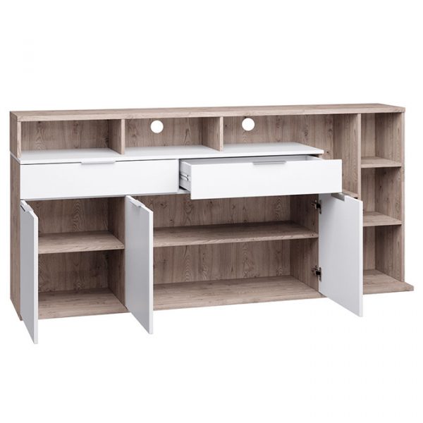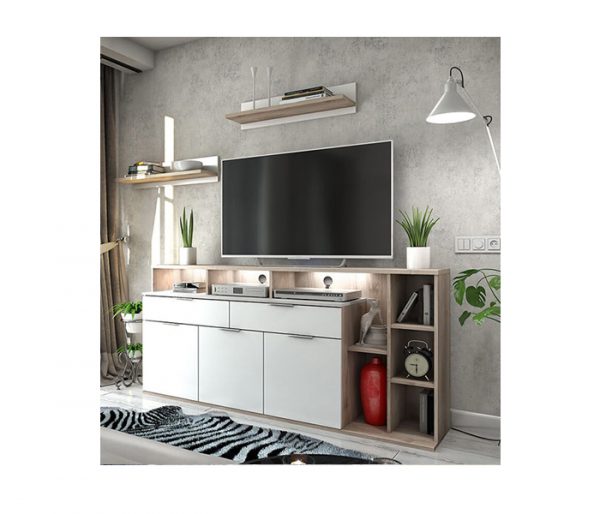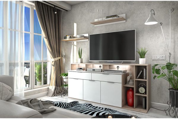 Сучасне поєднання фактур, а також комбінація відкритих та закритих елементів наділяють ТВ-тумбу «Вірджинія» особливим стилем та роблять її акцентом сучасного інтер’єру.
