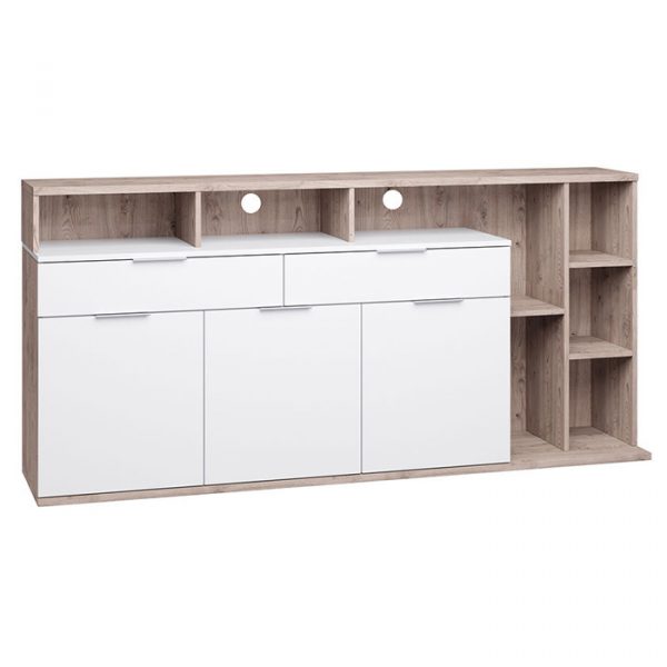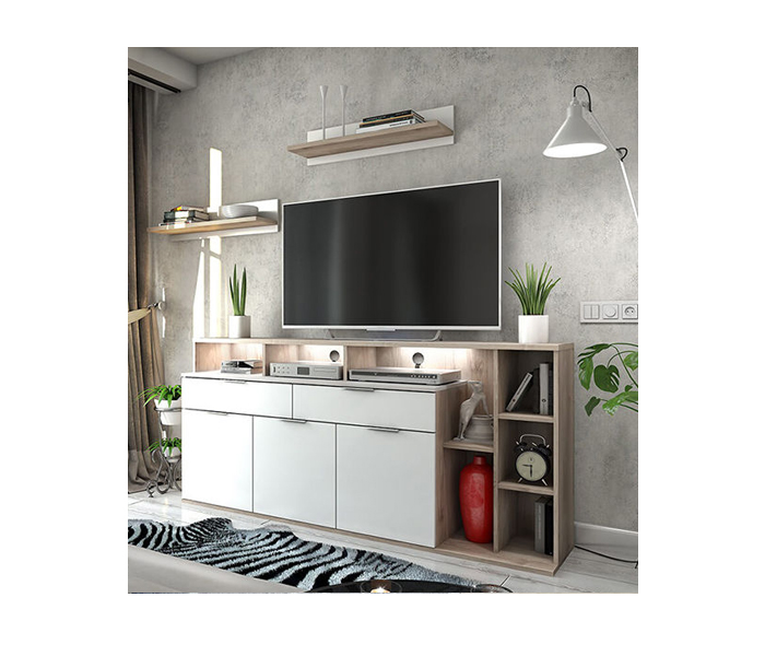 ТВ-тумба «Вірджинія» – незвичайна, надійна та функціональна тумба для вітальні. Чергування закритих і відкритих елементів виглядає стильно та сучасно. Продуманий стиль робить модель зручною для зберігання дрібниць. Суворі лінії та нейтральна кольорова гамма ідеально підходять до стилів лофт, сканді або баухаус.