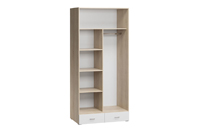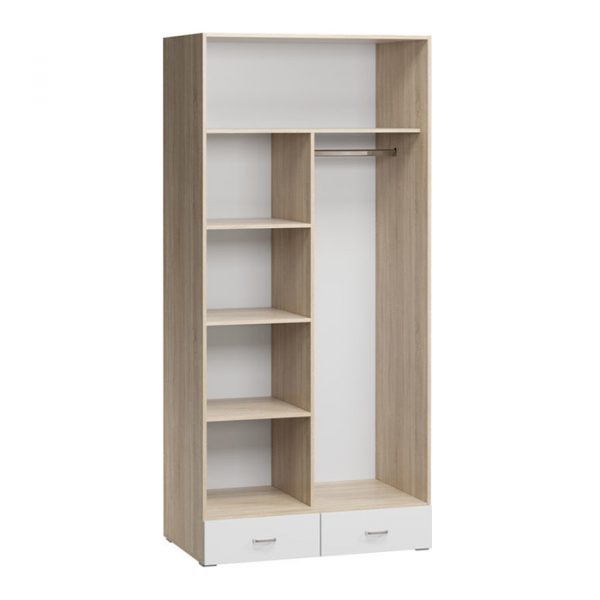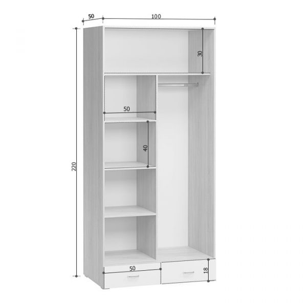 Шафа обладнана полицями по один бік і штангою по інший, а в нижній частині шафи розташовані дві висувні ящики. Усередині знайдеться місце як на вішалках, так складених речах.