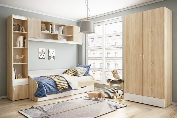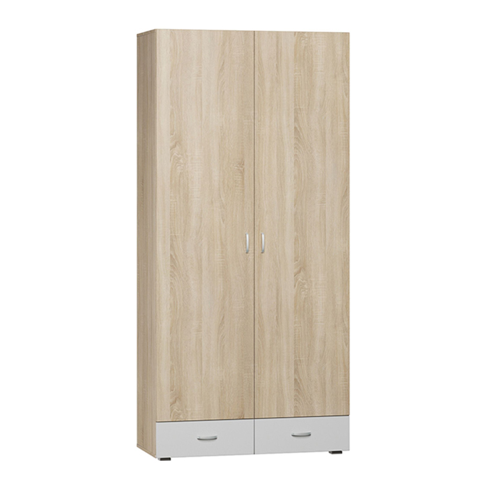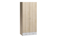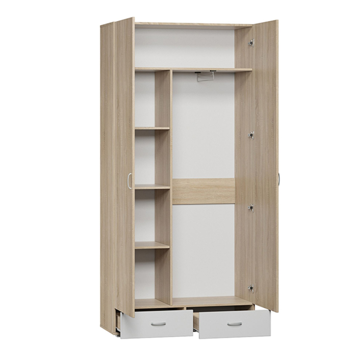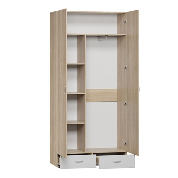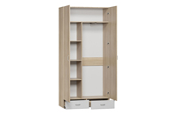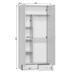 Шафа обладнана полицями по один бік і висувною вішалкою по інший, а в нижній частині шафи розташовані дві висувні ящики. Усередині знайдеться місце як на вішалках, так складених речах.