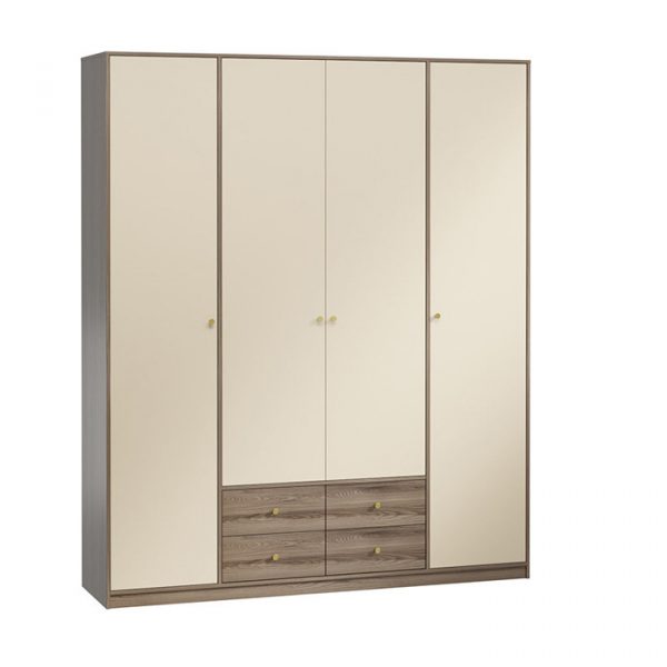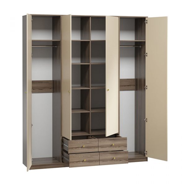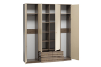 Шафа обладнана полицями та ящиками по центру, а також двома штангами по обидва боки шафи. Усередині знайдеться місце як на вішалках, так складених речах. Простора ширина та глибина конструкції робить модель гранично місткою.