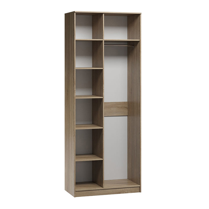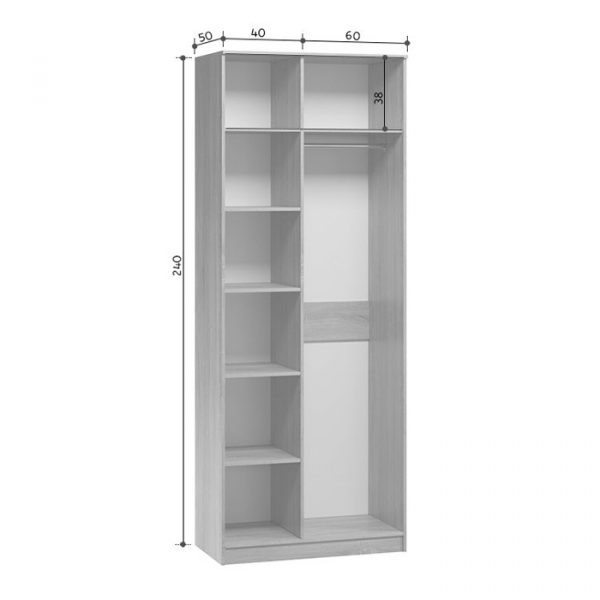 Шафа обладнана полицями з одного боку і штангою з іншого. Усередині знайдеться місце як на вішалках, так складених речах. Класична ширина та глибина конструкції робить модель гранично місткою.