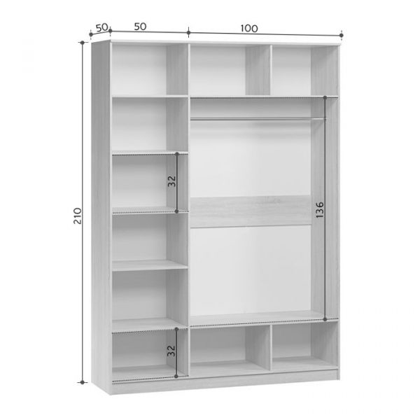 Шафа обладнана полицями з одного боку і штангою з іншого. Усередині знайдеться місце як на вішалках, так складених речах. Класична ширина та глибина конструкції робить модель гранично місткою.