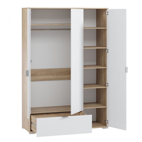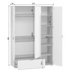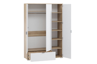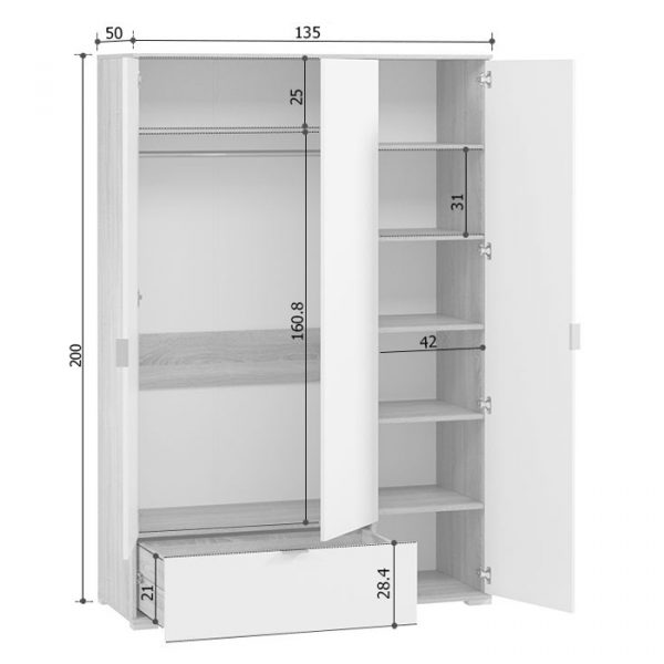Шафа обладнана полицями по один бік і штангою по інший, а в нижній частині шафи розташований великий ящик. Усередині знайдеться місце як на вішалках, так складених речах. Класична ширина та глибина конструкції робить модель гранично місткою.