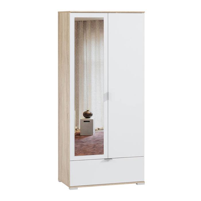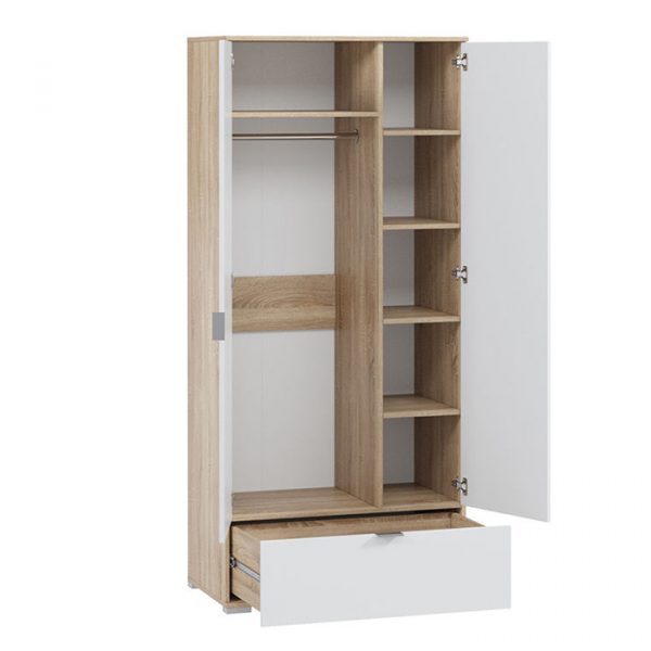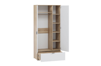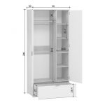 Шафа обладнана полицями по один бік і штангою по інший, а в нижній частині шафи розташований великий ящик. Усередині знайдеться місце як на вішалках, так складених речах. Класична ширина та глибина конструкції робить модель гранично місткою.