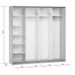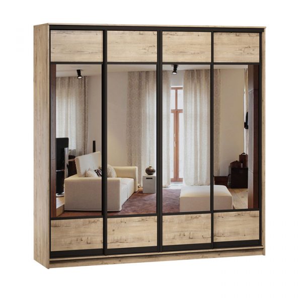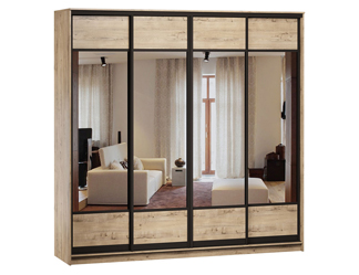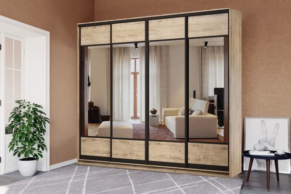 Чотирьохдверна шафа-купе «Делі» – практичне рішення для раціонального зберігання одягу та взуття. Дизайн шафи відмінно впишеться у сучасний простір. Велике дзеркало та контрастний профіль як декор – оригінальні деталі, що виділяють цю модель на тлі інших!