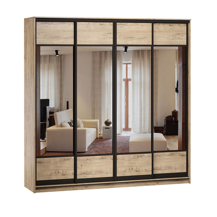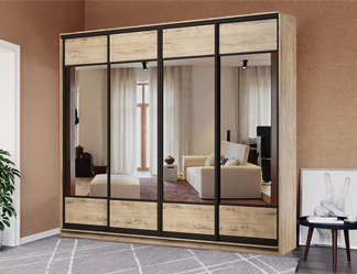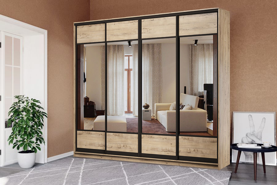Чотири високі дзеркала шафи підвищують функціональність моделі. Поверхня, що відбиває світло, не тільки дозволяє оцінити зовнішній вигляд перед виходом, але й візуально розширює простір навіть у невеликому приміщенні.