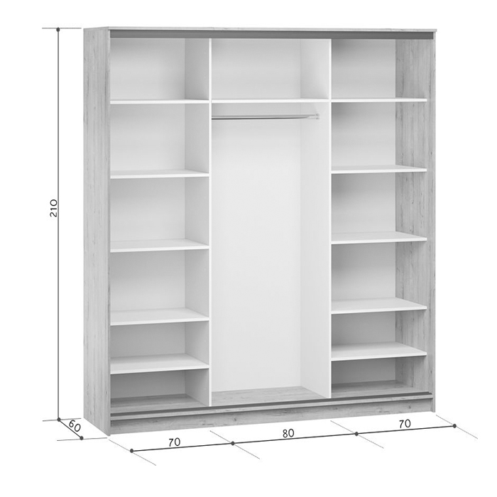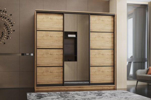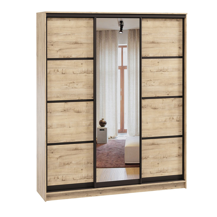 Завдяки ефектному поєднанню світлого відтінку корпусу з темними профілями шафа-купе «Феррара» виглядає строго та одночасно стильно. Його дизайн універсальний і підійде для будь-якої кімнати: вітальні, спальні або передпокою.