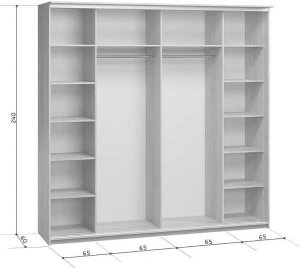Замовник може самостійно вибрати габарити шафи, кількість та розміри полиць, висоту прорізів, наявність антресольної частини, наявність та кількість ящиків.